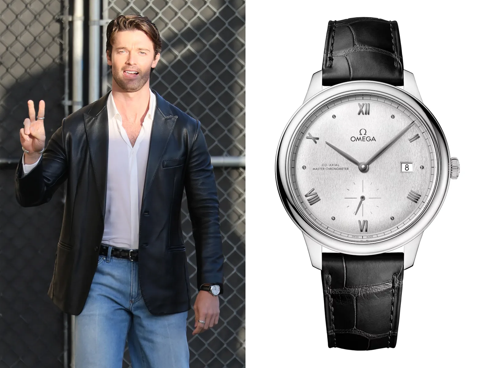 For another LA outing the following day, Schwarzenegger switched up the vibe, with a clean polished leather blazer, white shirt and stonewash jeans with a 41mm Swiss made fake Omega De Ville watches. A stainless steel ticker on a black strap is the kind of timeless combo that looks as good casually as with a suit (or a rugged black blazer in Schwarzenegger’s case). But rather than going for a classic white dial, the actor mixed things up with a clean brushed steel dial. It’s the kind of detail you’d expect on a high-end sports watch, but in something as classic as the De Ville, the contrast is more noticeable, and works really well – and the Roman numerals are a classy touch too.