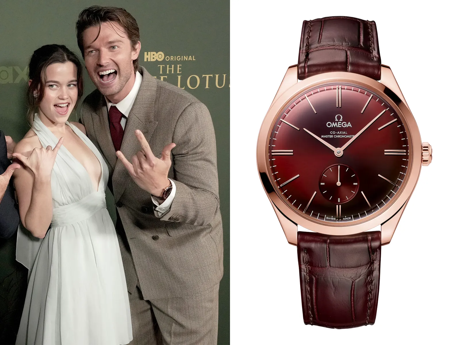 While on the press trail for the new show, Schwarzenegger kept his guns under wraps and instead chose to let two UK perfect replica Omega watches flexes do the talking – each time putting his kettle on full display with peace and horn signs respectively. For the World premiere, which he attended with his dad Arnold Schwarzenegger, he went all out for the occasion. A boxy double-breasted suit with a deep red tie came together nicely with his Omega De Ville Trésor in rose gold with a burgundy dial and strap.