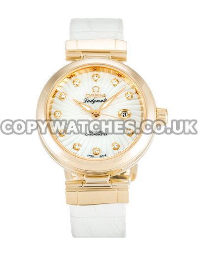 Exquisite and graceful, the 34 mm Omega De Ville Ladymatic 425.63.34.20.55.001 will decorate modern women to be more charming. The timepiece has mother-of-pearl dial that includes a date window at 3 o’clock as well as diamonds hour markers. The dial is protected by scratch-resistant sapphire crystal.