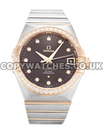The 38 mm model has diamonds paved bezel that is mounted on the rose gold and steel case. It is fitted on the rose gold and steel bracelet. Powered by the co-axial automatic movement, this Constellation performs reliably and precisely.