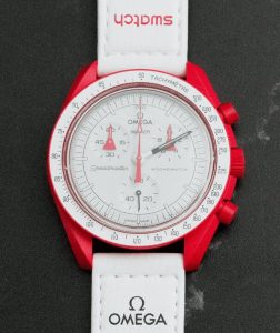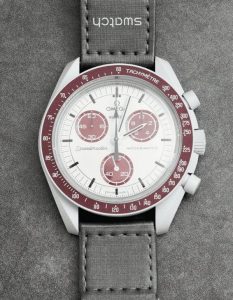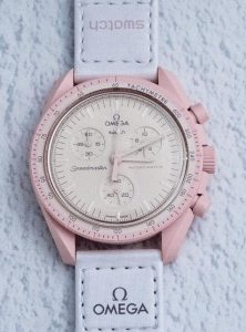 The Mission to Pluto MoonSwatch combines four major colours and creates a smart and versatile timepiece. Your eye is first drawn to the burgundy tones on the bezel and subdials, while the combination of neutral greys and white on the strap and Bioceramic case have a great balancing act. The beige-coloured dial is the finishing touch that puts this towards the top of our list for those looking to buy two or three 1:1 replica Omega x Swatch watches.